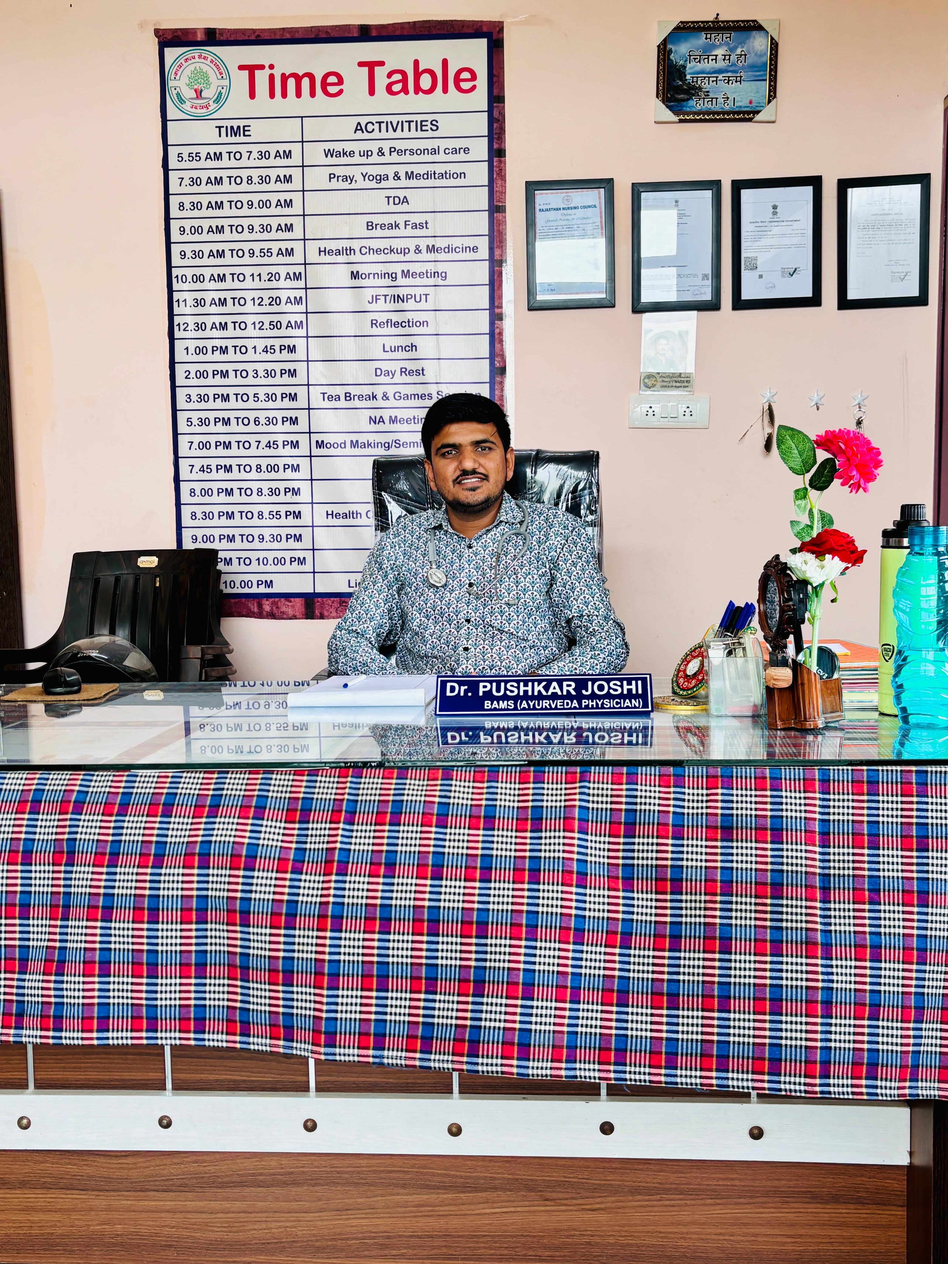 Dr. Pushkar Lal Joshi (BAMS) is a qualified and registered Ayurvedic physician associated with Kayakalp Sewa Sansthan, Udaipur (Nasha Mukti Kendra). He holds a Bachelor of Ayurvedic Medicine and Surgery (BAMS) degree and is registered with the Board of Indian Medicine, Rajasthan as a Class ‘A’ Vaidya (Ayurvedic Doctor). His registration is valid as per government norms, ensuring ethical and authorized medical practice.