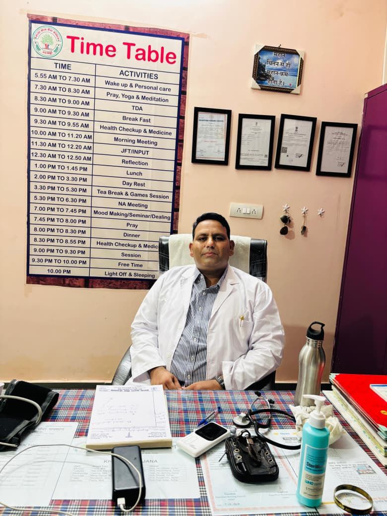 Dr. Dangi is not a full-time resident doctor at the Sansthan; however, he generously offers his medical guidance and time as a voluntary service (sewa). He supports the Sansthan by providing medical consultation, health assessment, and guidance during important stages of de-addiction and rehabilitation, ensuring patient safety and proper medical supervision when required.