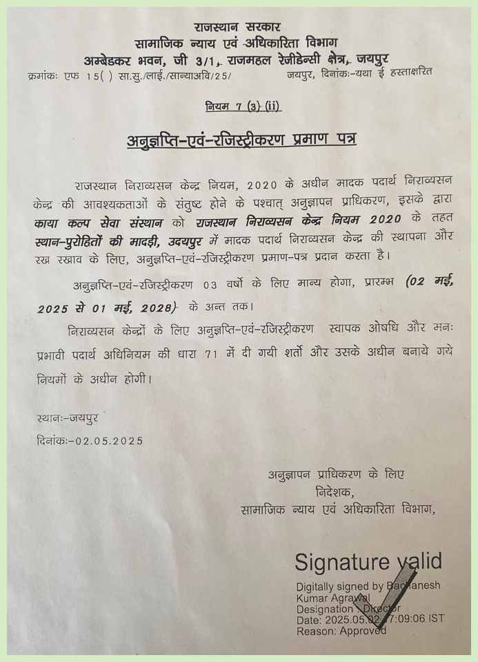 Kayakalp Sewa Sansthan, Udaipur (Nasha Mukti Kendra) is a government-recognized de-addiction and rehabilitation organization. Our Sansthan is licensed and approved by the Social Justice and Empowerment Department, Government of Rajasthan (सामाजिक न्याय एवं अधिकारिता विभाग, राजस्थान सरकार).